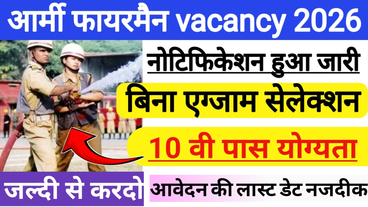 Army Fireman New Vacancy 2026: सेवा में फायरमैन भर्ती का नोटिफिकेशन जारी हो चुका है| बख्तर बंद मुख्यालय कर केंद्र और विद्यालय अहल्यानगर महाराष्ट्र की तरफ से फायरमैन और सहायक एमटीएस ग्रुप सी के पदों हेतु एक नया नोटिफिकेशन घोषित किया गया है| जो कि जिस तीन पदों पर यह नोटिफिकेशन जारी किया गया है|दसवीं पास कर चुके अभ्यर्थी ऑफलाइन माध्यम से इस भर्ती के फॉर्म को भर पाएंगे| पुरुष व महिला दोनों अभ्यर्थियों के लिए आवेदन करने की लास्ट डेट 6 मार्च निर्धारित किया गया है| 6 मार्च के पहले आप इस भर्ती के फॉर्म को भर पाएंगे|