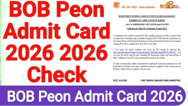BOB Peon 2026 Admit Card: बैंक ऑफ़ बड़ौदा चपरासी एडमिट कार्ड 2026 का जो प्रीलिम्स एग्जाम का एडमिट कार्ड है …