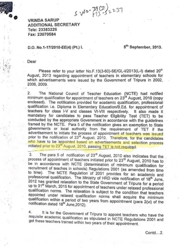 जारी पत्र के दौरान यह बताया गया है कि 2010 के पहले जितने भी भर्तियां हैं उसको एनसीटीई के 2001 वाले नियमों के हिसाब से माना जाने वाला है। उस समय भी कुछ जरूरी योग्यता तय किया गया था। लेकिन टेट आवश्यक नहीं था इसके अलावा 18 जून 2012 को सरकार के द्वारा त्रिपुरा को कुछ समय के लिए और हाथ दिया गया था और इसी राहत के बीच 31 मार्च 2015 तक चयन में देर दिया गया था। लेकिन इसके साथ यह शर्त तय कर दिया गया था कि जो शिक्षक चयन इस छूट में होगी उन्हें 2 वर्ष के अंदर अपनी योग्यता पूरा करना पड़ेगा। यानी सरकार ने थोड़ा राहत दिया है लेकिन साथ में जिम्मेदारी को तय कर दिया है।
